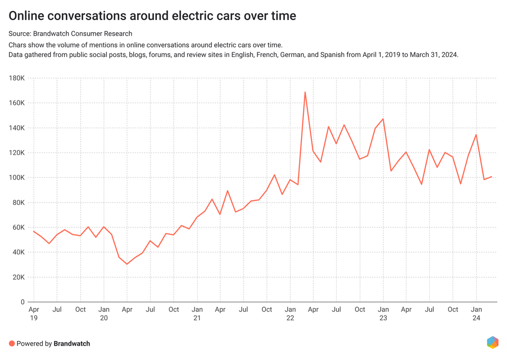 Meanwhile, as gas and used car prices have risen, more consumers have considered switching to electric cars. Perhaps as e-cars become more normalized, the hype is slowing down, and this is reflected in online conversations. From April 1, 2023 to March 31, 2024, mentions of electric cars are down 12% compared to the previous 12 months.