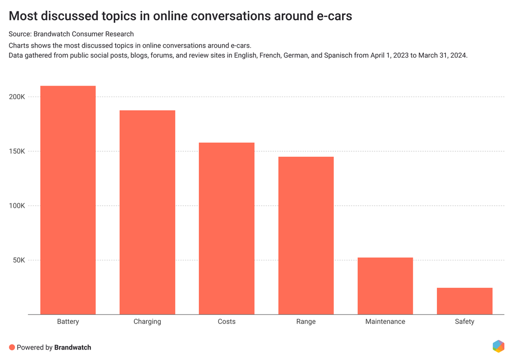 The most discussed topics in EV conversations are battery, charging, and costs. Consumers from France and Germany are more likely to talk about costs than consumers from other regions. In conversations around the battery, consumers are concerned about the life of a battery, and how much a replacement will cost.