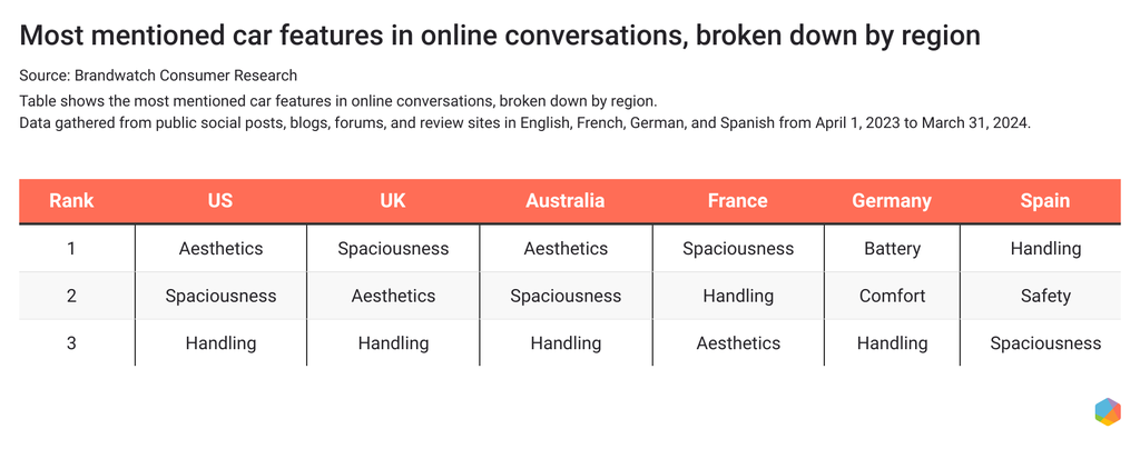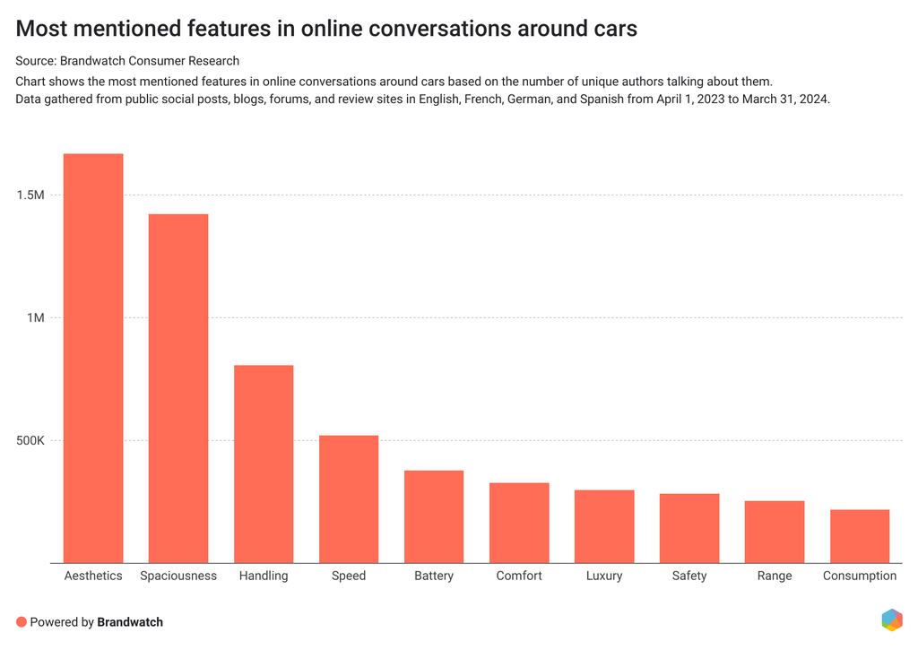 Speed, battery, and comfort are other factors that come up frequently in online conversations. More people are talking about luxury, aesthetics, security, and batteries, with mentions seeing an uptick from April 1, 2023 to March 31, 2024 compared to the previous 12 months.