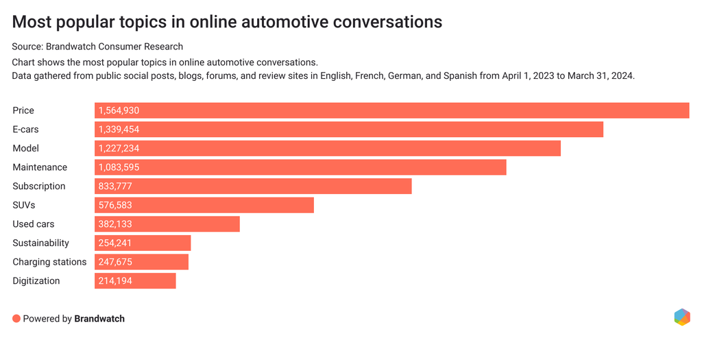What do consumers discuss other than car brands? Not surprisingly, price is the most discussed topic in online car conversations. E-cars and car models come in second and third.