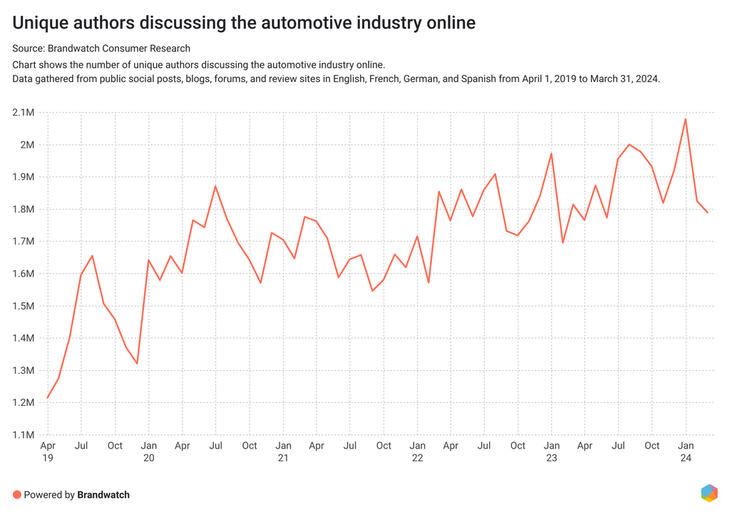 Consumers have a lot to say about the automotive industry. More than 13 million unique authors talked about cars from April 1, 2023 to March 31, 2024, resulting in nearly 41 million online mentions. The number of unique authors has been growing over the past few years, with a 4% increase in the period analyzed compared to the previous 12 months.
