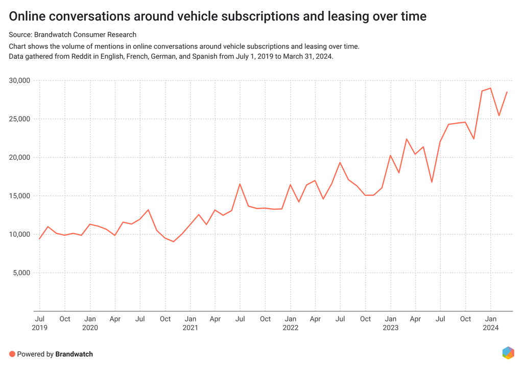 Having to own a car to be able to drive has long been a thing of the past and, with subscriptions growing in many industries, drivers now have more options when renting a car. Consumers are showing more interest in the topic online, too. Looking at Reddit data, 28% more unique authors are talking about subscriptions and leasing. This resulted in more than a third more total online mentions from April 1, 2023 to March 31, 2024 compared to the previous 12 months.