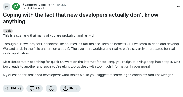 For example, in the Reddit thread below which was posted in r/learnprogramming, a user is concerned that school and online courses aren’t actually preparing students well for the real world.