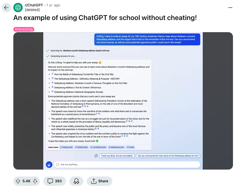 While it’s easy to jump to negative conclusions about how AI might impact education, there are plenty of positive ways it can be used to facilitate learning. And these are often celebrated online, for example in this thread about using ChatGPT for information on sources and argument points.