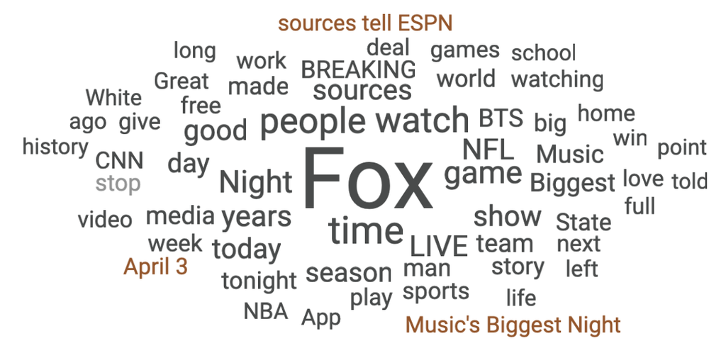 This topic cloud represents consumer conversation between November 1 2021 and May 1 2022. The largest topic on the word cloud, ‘Fox’ or Fox News, was seen as one of the biggest topics in discussions relating to the top TV networks, with some consumers questioning their limited ability to manage their cable service bundle.