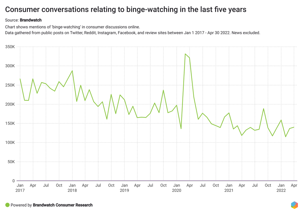 While overall, ‘binge-watching’ is mentioned in conversations less and less, that doesn’t necessarily mean consumers are shifting away from TV.