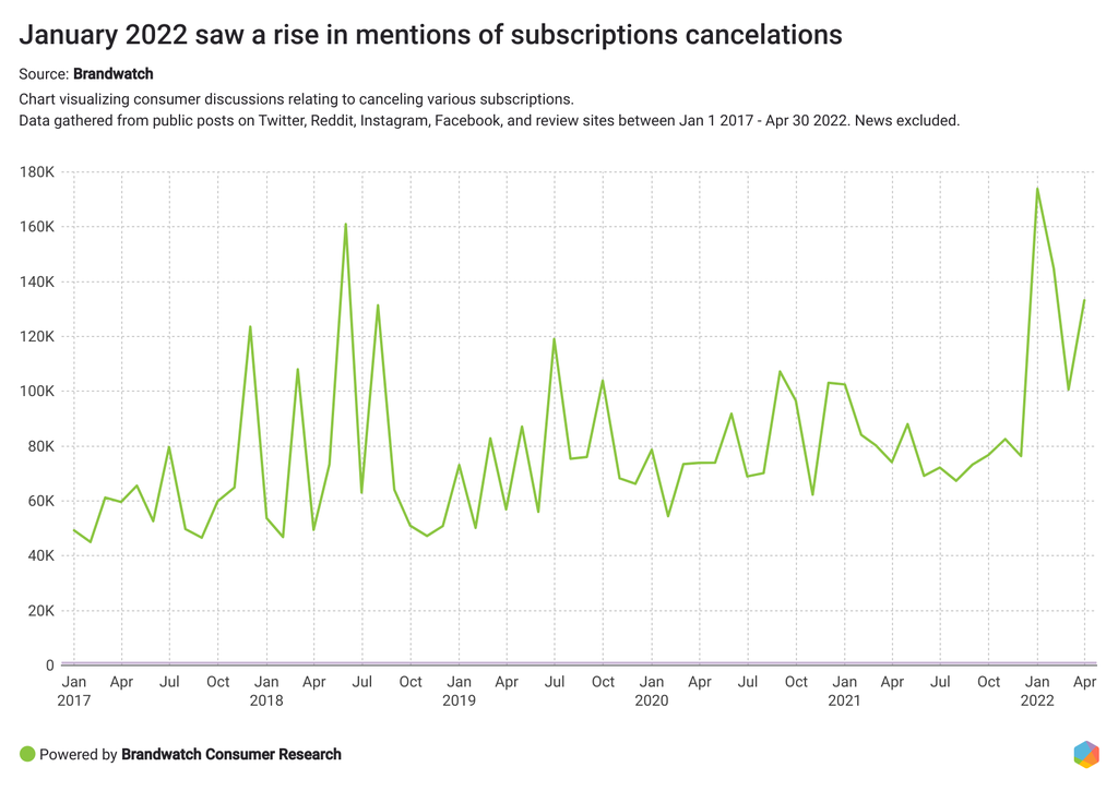 With the help of Brandwatch Consumer Research, we found that while there might be a seasonal pattern affecting the subscription cancelation conversation (you can see spikes in late spring and summertime), there was a significant increase in the volume of mentions in January 2022.