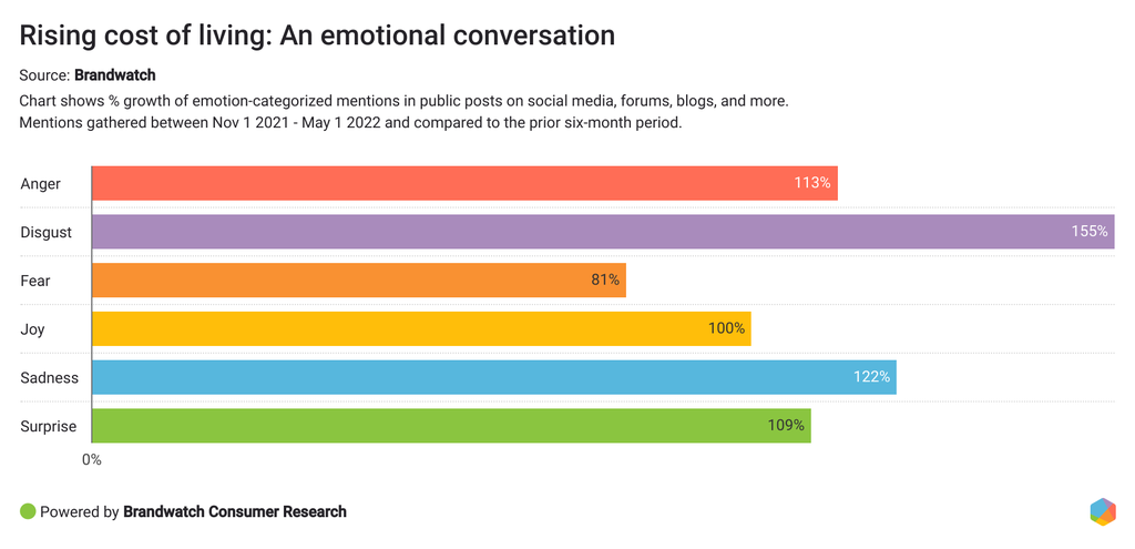 We also looked into how consumers emoted in conversations about the cost of living. Looking at the chart below, it’s clear that the issue has caused a variety of emotions in consumers, with sadness and anger dominating the conversation and the emotion of disgust growing exponentially (up 155% when compared to the previous six-month period we studied).