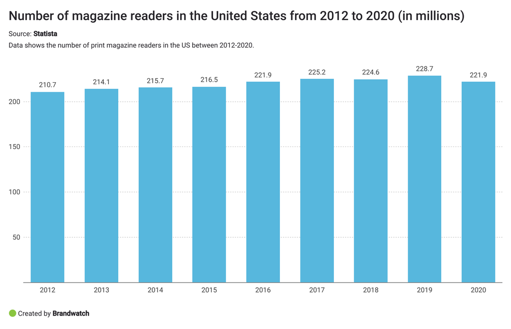 According to this Statista report, in 2020, there were 221.9 million magazine readers aged 18 or older in the United States. This marked a decrease of over six million readers since the previous year. On the other hand, the figure for 2019 was the highest recorded since 2012, and trends during that period indicated a gradual annual increase in the number of magazine readers.