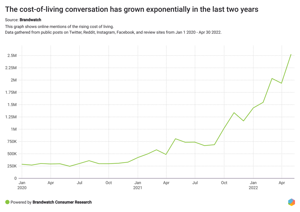 We looked into mentions between November 1 2021 and May 1 2022, and the number of mentions containing ‘cost of living’ reached 16.86m, an increase of 228% compared to the previous period. Meanwhile, over 5m unique authors discussed the climbing costs of living (120% more when compared to the previous six-month period).