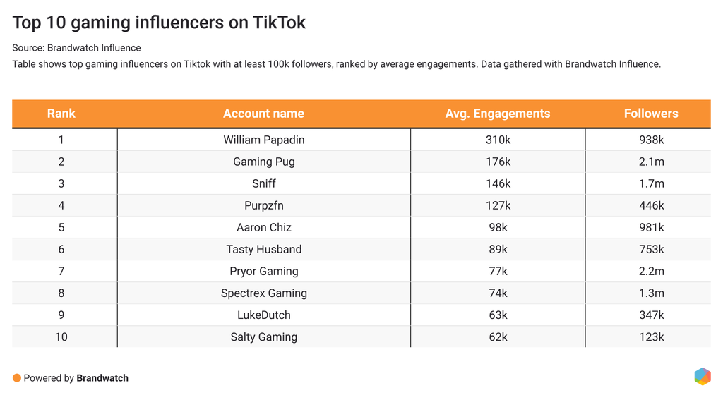 Influencers and content creators have a huge impact on the purchasing decisions of their followers. Gamers follow them to get their opinions on the latest games and watch them play the games in short videos or live streams. With Brandwatch Influence, we looked for influencers on TikTok with at least 100k followers who cover gaming topics in English.