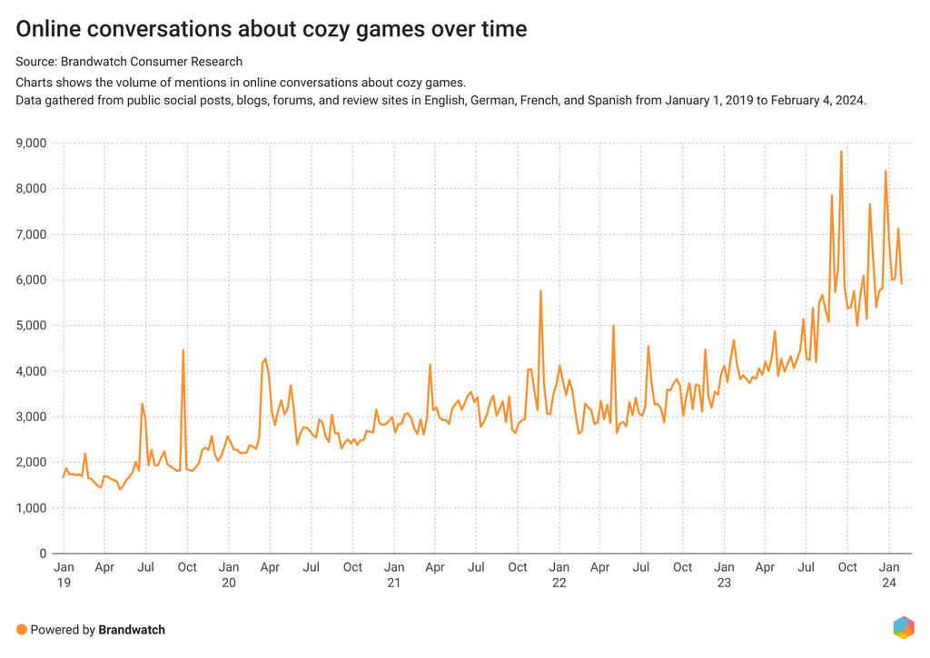 In 2023, the trend took off, with many new cozy games hitting the market and fueling online conversations. Online mentions of cozy games increased by 57% from January 16, 2023 to January 15, 2024, and according to Google Trends, search interest in "cozy games" reached a 5-year high in December 2023.