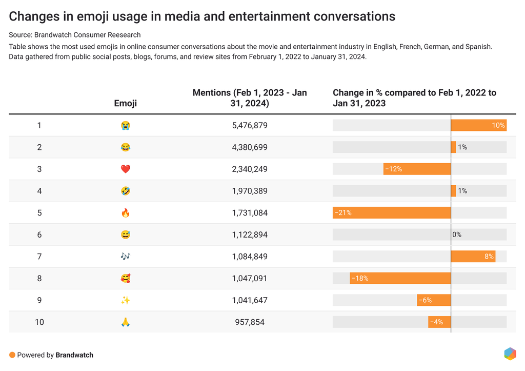 In media and entertainment conversations, the ‘loudly crying face’ emoji 😭 takes the lead among the top 10 most used emojis, even surpassing the popular ‘face with tears’ 😂. However, this shift doesn't mean that conversations are getting sadder. Rather, it shows that emoji usage is evolving. While boomers and Gen X might use this emoji to express extreme sadness, millennials use the emoji to express strong emotions, like when they’re feeling loved or when something is beautiful or pure. Finally, Gen Z is more likely to use the emoji to express if something is funny but isn’t meant to be.