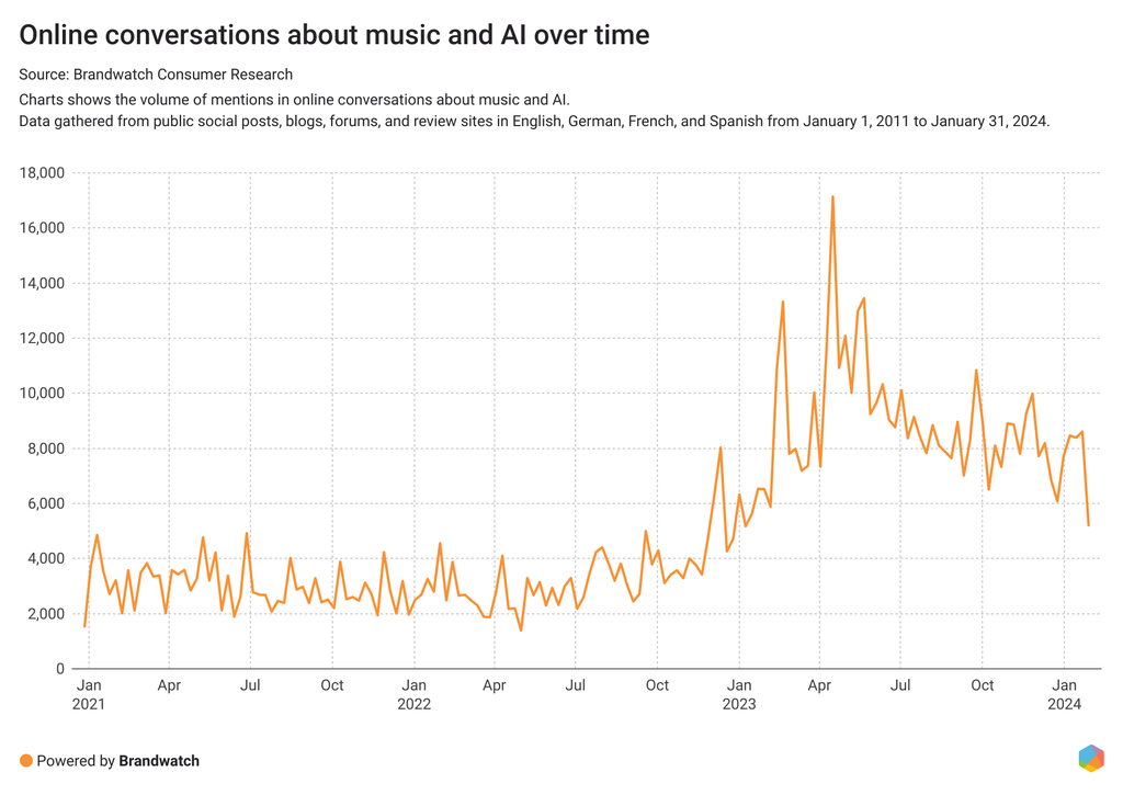And consumers are paying attention. According to Google Trends, search interest in "music and AI" reached a five-year high in January 2023, and online conversations increased more than 150% from February 1, 2023, to January 31, 2024, compared to the previous 12 months.
