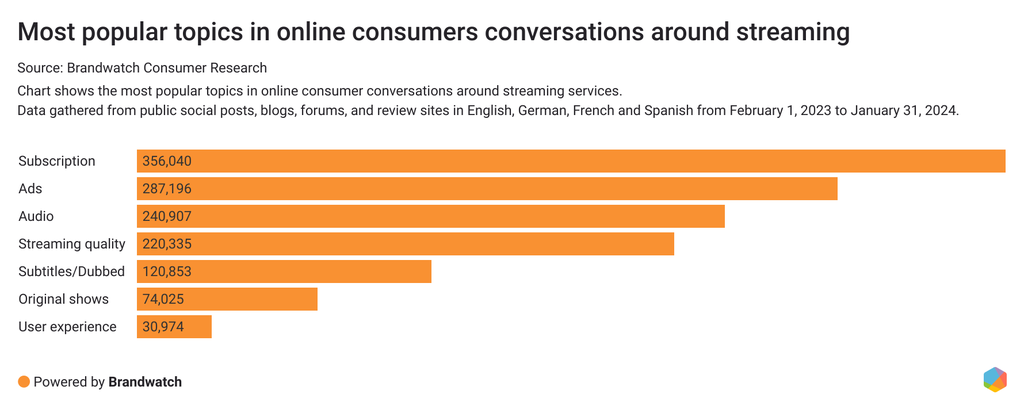 In consumer discussions about streaming, subscriptions and ads are the most talked about topics, surpassing other important themes like streaming or audio quality. From February 1, 2023 to January 31, 2024, discussions on original shows, subscriptions, and ads experienced a surge, marking an increase compared to the previous 12 months. In the same period, mentions of audio and streaming quality, subtitles, and user experience in general saw a decline.