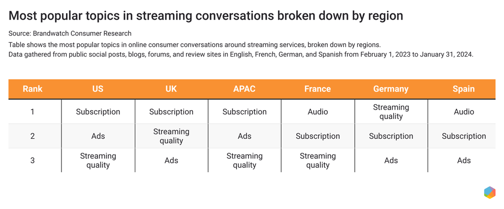In particular, consumers in the US, the UK, and the APAC region are talking about streaming subscriptions, while consumers in France, Germany, and Spain are more preoccupied with audio and streaming quality.