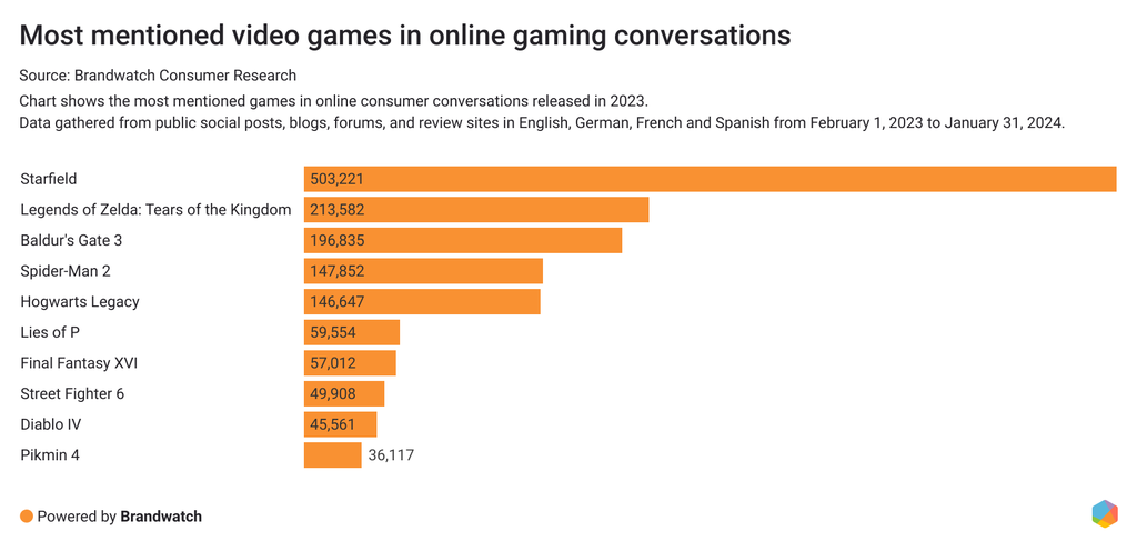 As we see on the chart, Starfield, Legend of Zelda: Tears of the Kingdom, and Baldur's Gate 3 are the most discussed video games released in 2023.