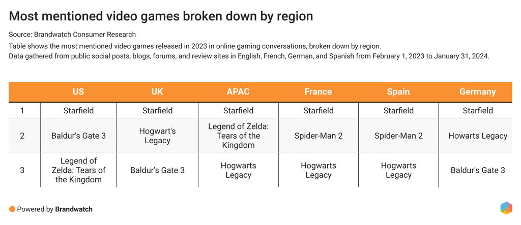 Looking at the regional data, apart from Starfield being in first place, there are some differences when it comes to the most discussed games: