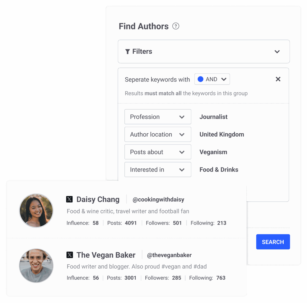 Quickly search an influencer database of over 30m creators based on the topics and metrics that matter to you